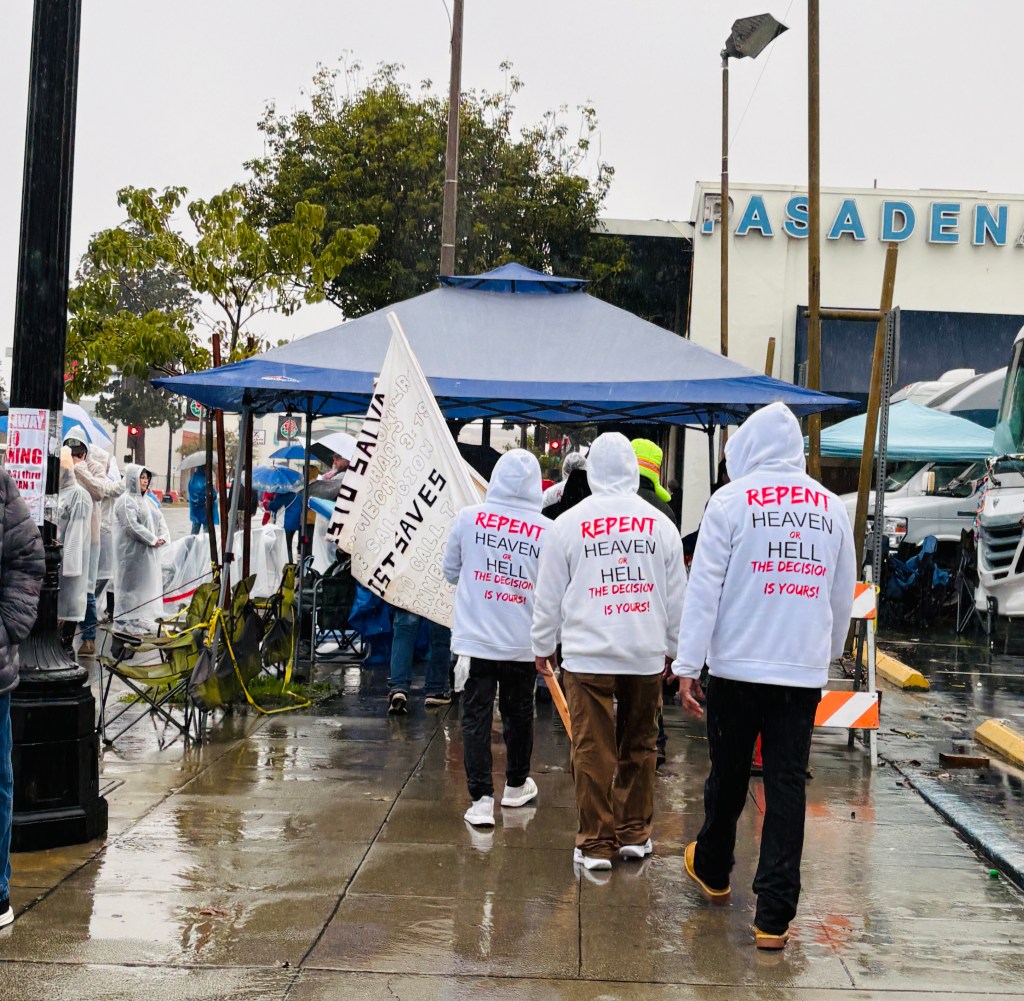 Still in the car, we’ve been waiting for a break in the rain, but it hasn’t arrived yet. Parade start-time is approaching, so we pull on our ponchos, ready our bags, and step out into the downpour. At least it’s daylight now. Suddenly the festive atmosphere surrounds us. I get the sense that this is about as friendly a scene as you’ll find in Southern California.