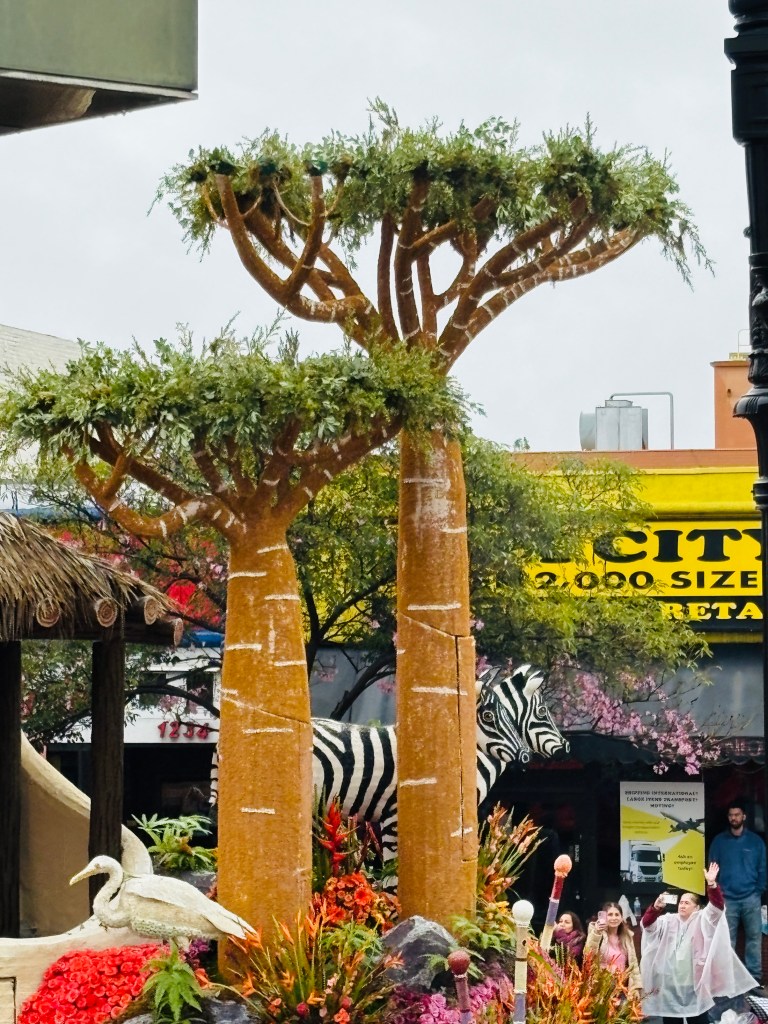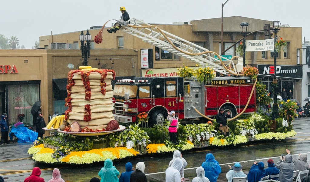 My daughter is particularly impressed by the perpetually waving lovely 2026 Rose Court, the elephants on the San Diego Zoo Safari Park (announcing the park’s new Elephant Valley attraction), and the stack of hot syrupy pancakes featured on the City of Sierra Madre float.