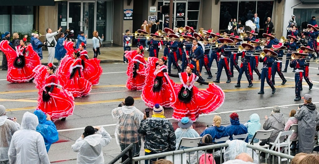 “Two hot chai lattes with oat milk, one hot cocoa, and a croissant, please.” As one of the few cars in line, we quickly move along the Starbucks drive-through and are soon pulling into our assigned parking space, right on time. Our (uncovered) bleacher seats are only two blocks away, and the parade starts at 8. There’s only one hiccup—it’s raining. Hard.