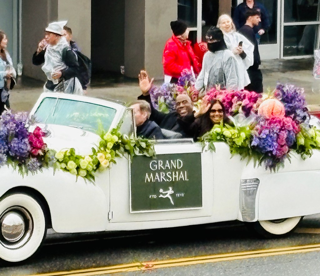 My husband and I enjoy the gorgeous City of San Francisco float (our former hometown), the Star Trek 60 “Space for Everybody” float featuring a grinning George Takei and Tig Notaro, Apple TV+’s Shrinking float (one of our favorite shows, shot in Pasadena—where are Harrison Ford and Jason Segal and Jessica Williams??), and a glimpse of the great Earvin “Magic” Johnson, the 2026 Pasadena Tournament of Roses Grand Marshal, still going strong at 66 years old.
