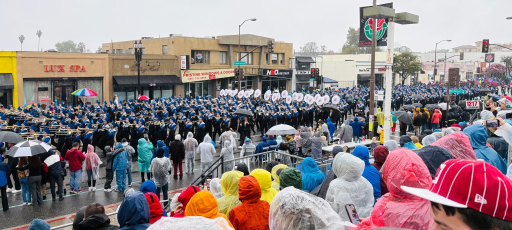 We are prepared. The day prior, after trying four separate stores, we were finally able to purchase plastic rain ponchos (never mind that we now appear to be huge LA Rams fans). We are also equipped with plastic garbage bags to sit on, snacks, and a change of clothes. My husband, who is attending the Rose Bowl football game after the parade, has his own see-through bag packed complete with regulation-sized water bottles and a towel. We waive off the friendly lady weaving through the nearly flooded parking lot, offering Rose Parade seat cushions for $20 each.