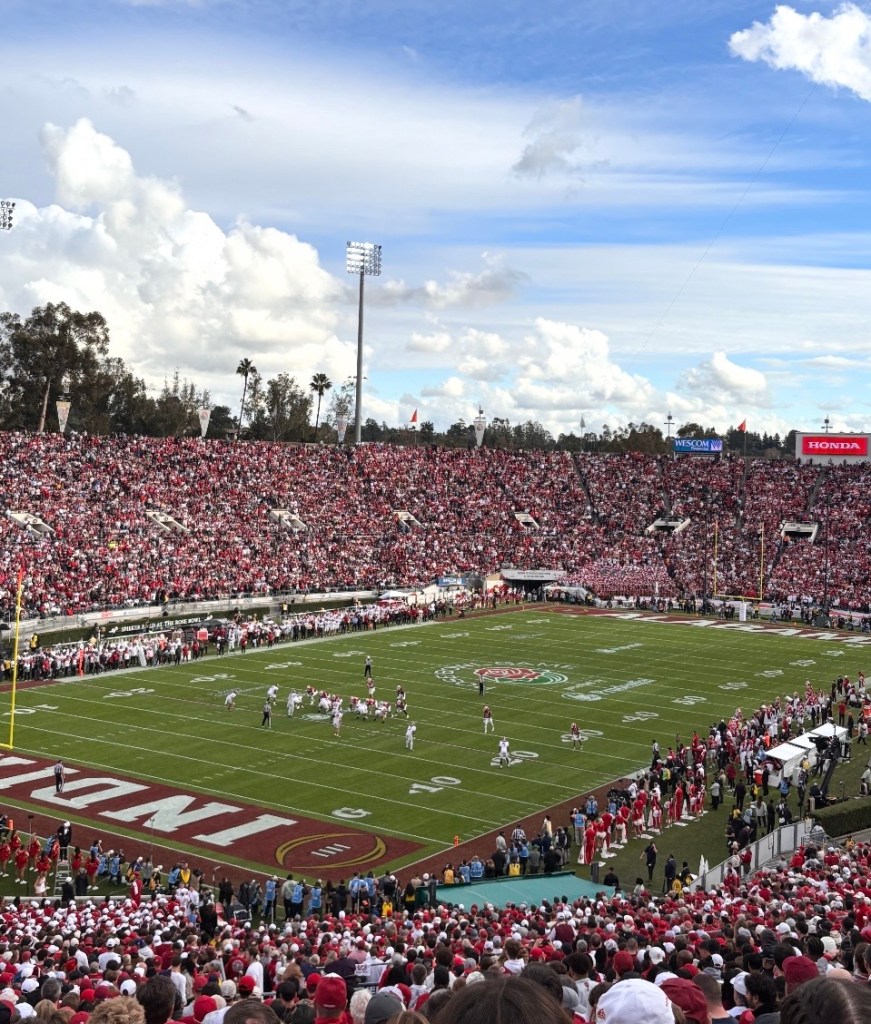 The parade has ended, and for the most part, so has the rain. Walking carefully down the bleachers, we make our way to the street, where we part ways with my husband. Father and daughter hug tightly, and we tell him to enjoy an experience he has been dreaming about since he was a child, his Indiana University team playing in the Rose Bowl. (Not exactly a) spoiler alert—they won.
