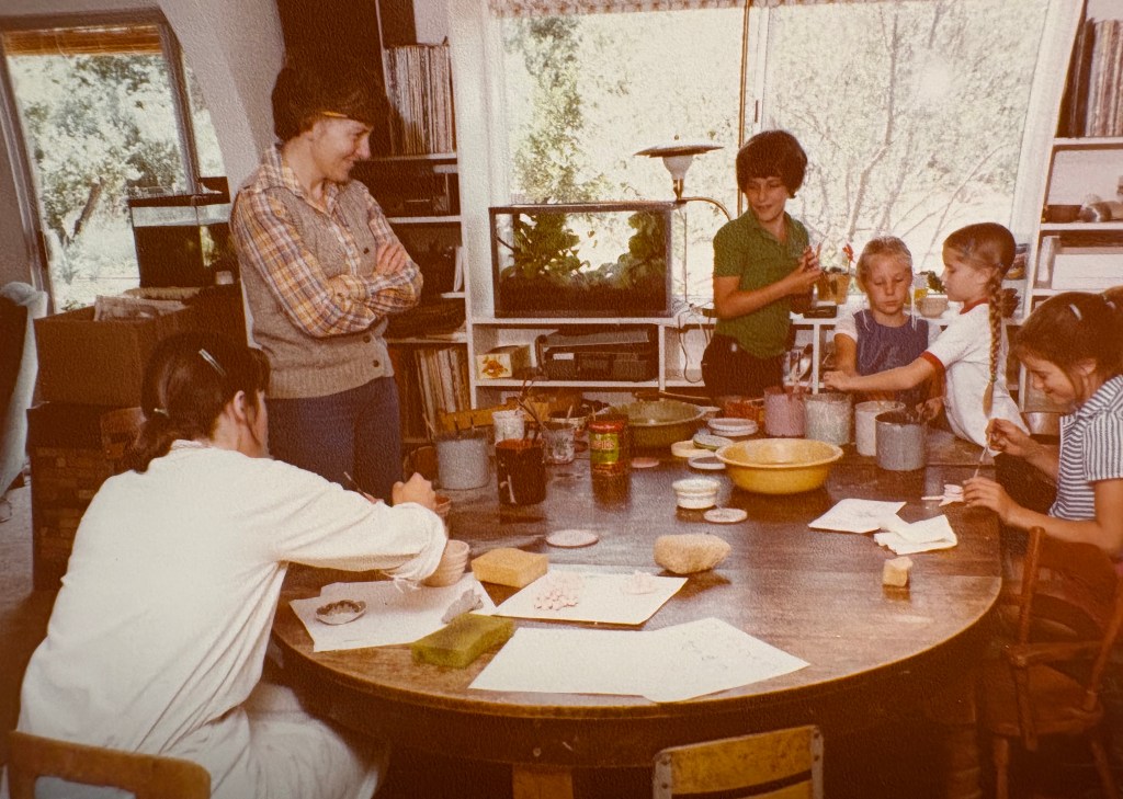 Nancy oversees a class art project, 1982. I am on the right in the striped shirt.